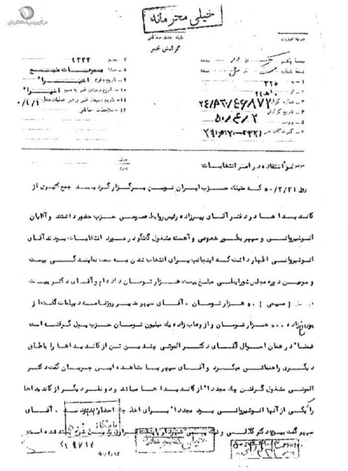 روز 31 / 3 / 50 که میتینگ حزب ایران نوین برگزار گردید جمع کثیرى از کاندیداها در دفتر آقاى پیرزاده رئیس روابط عمومى حزب حضور داشتند و آقایان انوشیروانى و سپهر به طور خصوصى و آهسته مشغول گفتگو در مورد انتخابات بودند آقاى انوشیروانى اظهار داشت که: اینجانب براى انتخاب شدن به سمت نمایندگى بیست و سومین دوره مجلس شوراى ملى مبلغ بیست هزار تومان دادهام و آقاى دکتر بیست اپل (مسیحى) 50 هزار تومان. آقاى سپهر مدیر روزنامه دیپلمات گفت: از پورداغزاده 500 هزار تومان و از وهابزاده یک میلیون تومان حزب پول گرفته است. ضمناً در همان احوال آقاى دکتر الموتى چندین تن از کاندیداها را به اطاق دیگرى راهنمائى مىکرد و آقاى سپهر با مشاهده این جریان گفت: دکتر الموتى مشغول گرفتن چک مجدداً از کاندیداها مىباشد و دو نفر دیگر از کاندیداها را که یکى از آنها انوشیروانى بود مجدداً براى اخذ چک احضار نمودند. آقاى سپهر گفت: بین دکتر کلالى و نیکپى شهردار پایتخت قرارى بدین شرح بسته شده است. که دکتر نیکپى برادر کلالى را که بیکار است به مدیر عاملى شرکت واحد منصوب نماید و در ازا آن آقاى اعزازالدوله نیکپى برادر آقاى شهردار به سمت سناتور انتخابى اصفهان برگزیده شود.