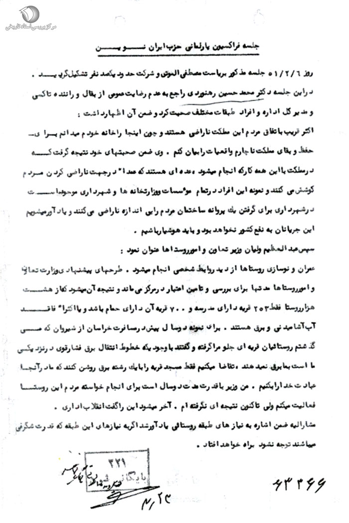 روز 6 / 2 / 51 جلسه مذکور به ریاست مصطفی الموتی و شرکت حدود یکصد نفر تشکیل گردید. در این جلسه دکتر محمد حسن رهنوردی راجع به عدم رضایت عمومی از بقال و راننده تاکسی و مدیر کل اداره و افراد طبقات مختلف صحبت کرد و ضمن آن اظهار داشت: