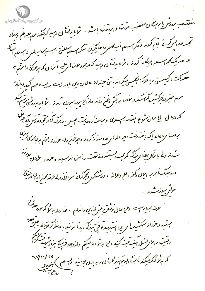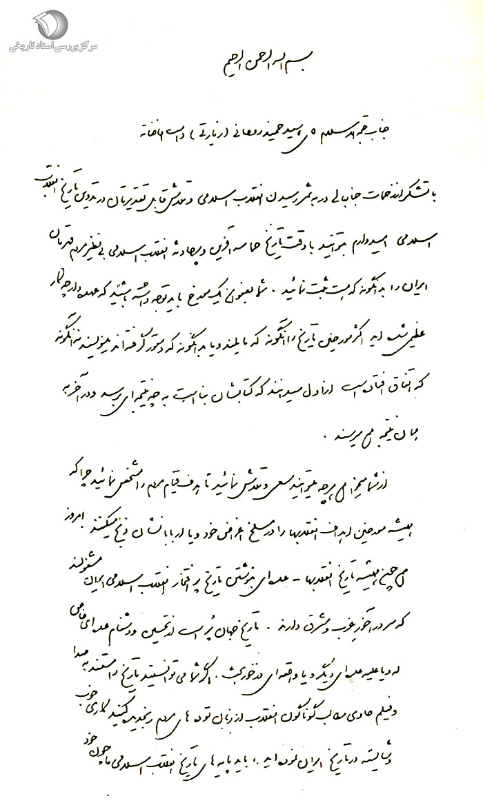 با تشکر از زحمات جنابعالى در به ثمر رسیدن انقلاب اسلامى و تلاش قابل تقدیرتان در تدوین تاریخ انقلاب اسلامى، امیدوارم بتوانید با دقت، تاریخ حماسه آفرین و پر حادثه انقلاب اسلامى بىنظیر مردم قهرمان ایران را بدانگونه که هست ثبت نمائید. شما به عنوان یک مورخ باید توجه داشته باشید که عهدهدار چه کارِ عظیمى شدهاید. اکثر مورخین، تاریخ را آنگونه که مایلند و یا بدانگونه که دستور گرفتهاند مىنویسند، نه آنگونه که اتفاق افتاده است. از اول مىدانند که کتابشان بنا است به چه نتیجهاى برسد و در آخر به همان نتیجه هم مىرسند.