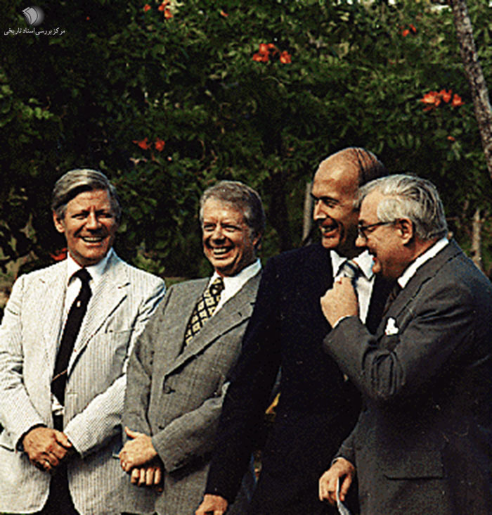 از راست: جمیز کالاهان نخست وزیر انگلیس، ژیسکار دستن رئیس جمهور فرانسه، جیمی کارتر رئیس جمهور آمریکا، هلموت اشمیت نخست وزیر آلمان در کنفرانس گوادلوپ