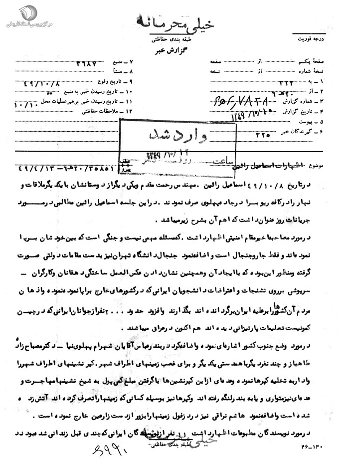 اظهارات اسماعیل رائین در باره مسائل کشور از جمله تظاهرات دانشجویان در خارج کشور، فساد پهلوی و درباریان، نفوذ بهائیان در ارتش