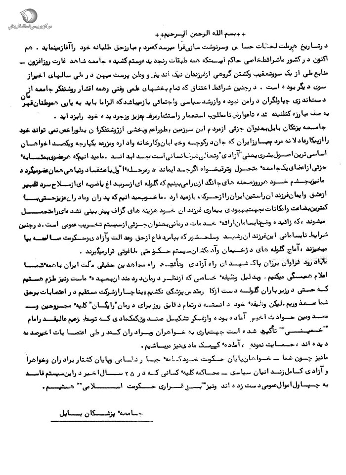 در تاریخ هر ملّت لحظات حساس و سرنوشتسازی فرا میرسد که مردم مبارزهی حقطلبانهی خود را آغاز مینمایند. هم اکنون در کشور ما شرائط خاصی حاکم است که همه طبقات رنجدیده و ستم کشیده جامعه شاهد غارت روز افزون منابع ملّی از یک سو و تعقیب و کشتن گروهی از فرزندان نیک اندیش و وطن پرست میهن در طیّ سالهای اخیر از سوی دیگر بوده است. در چنین شرائط اختناق که تمام بخشهای علمی و فنی و همه اقشار روشنفکر جامعه از دست اندازی چپاولگران در امن نبوده و از رشد سیاسی و اجتماعی باز میماند که الزاماَ باید به یاری هموطنان قهرمان به صف مبارزه کشانیده شده تا عوارض نامطلوب استعمار و استثمار مردم عزیز و زجر دیده را بزداید، جامعهی پزشکان بابل به عنوان جزئی از مردم این سرزمین به طور اعم و بخشی از روشنفکران به طور خاص نمیتواند خود را از پیکار عادلانه مردم مبارز ایران که جان در کوچه و خیابان و کارخانه و اداره و مزرعه یکپارچه و یکصدا خواهان اساسیترین اصول بشری یعنی «آزادی» و تعالی شرف انسانی است، جدا بداند. ما میدانیم که هر عضوی به مثابهی جزئی از اعضای یک جامعه متحول و ترقیخواه اگر جدا بماند در مرحلۀ اول باعث فساد و تباهی همان عضو میگردد. ما نیز به چشم خود هر روز صحنههای جانگدازی را میببینیم که گلولهای از سرب داغ یا ضربهای از سلاح سرد قلب پر از عشق و ایمان فرزندان راستین ایران را از حرکت باز میدارد. ما خوب میدانیم که پدران و مادران عزیز حتی با کمترین بضاعت و امکانات، جهت بهبود بیماری فرزندان خود هزینههای گزاف پیش بینی نشدهای را متحمل میشوند که زائیده وضع نابسامان ارائه خدمات درمانی به عنوان جزئی از سیستم تخریب عمومیاست. در چنین شرایط نابسامانی این فرزندان رشید و سلحشور که به پاس دفاع و عدالت و آزادی و حکومت صالحه به پا میخیزند، آماج گلولههای دژخیمان و آدمکشان سیستم حکومتی طاغوتی قرار میگیرند.