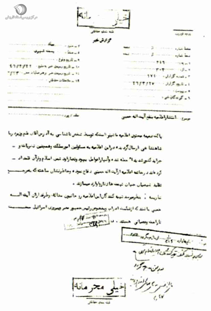 پاکت ضمیمه محتوای اعلامیه ماشینی است که توسط شخص ناشناسی به آدرس آقای علم وزیر دربار شاهنشاهی ارسال گردیده در این اعلامیه به مسئولین امور مملکت و همچنین نشریات و جراید کشور شدیداً حمله شده و آنها را عوامل یهود و نصارا و دشمن اسلام و قرآن قلمداد کردهاند در خاتمه اعلامیه از آیتالله خمینی دفاع نموده و خاطر نشان ساخته که به مرجع تقلید شیعیان جهان تهمتهای ناروا وارد میسازند.