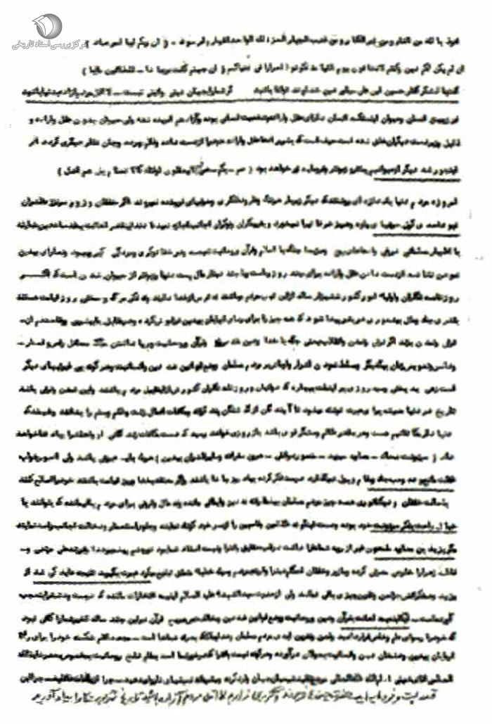 مگر یزید بن معاویه ملعون غیر از رویه شماها را داشت در قلب حقایق و افترا و تهمت استاد شما بود نور چشم پیغمبر خدا و فرزند علی مرتضی و فاطمه زهرا را خارجی معرفی کرده و با زور و خفقان، احکام دین را وارونه به مردم وسیله خطباء متملق تبلیغ میکرد. عبرت بگیرید، نتیجه عاید کی شد، از یزید و همفکرانش جز لعن و نفرین چیزی باقی نماند ولی از حضرت سیدالشهداء علیه السلام این همه افتخارات مانده که دوست و دشمن را به تعجب آورده است آیا این همه اهانت به قرآن و دین و روحانیت و وضع قوانین ضد دین و مخالف نص صریح قرآن در این چند ساله اخیر شما را کافی نبود که خود را رسوای عام و خاص قرار دادید و لعن و نفرین ابدی مردم مسلمان و خدا و ملائکه بدرقه شماها است – مجدداً قلم شکسته خود را برای رضای اربابان بی دین و دشمنان دین و انسانیت به جولان در آورده و هر گونه تهمت و افترا که در خور شما است به مقام شامخ روحانیت به خصوص به حضرت آیتالله العظمی آقای خمینی ادام الله ظله العالی مرجع تقلید شیعیان جهان وارد کرده و بیشرمانه نسبتهای ناروا میدهید – چرا از مکافات غافلید – چرا این قدر پست و فرومایهاید – حضرت حسین (ع) فرمودندک اگر دین ندارید لااقل مردم آزاده باشید، تاریخ شهریور 20 را به یاد آورید.