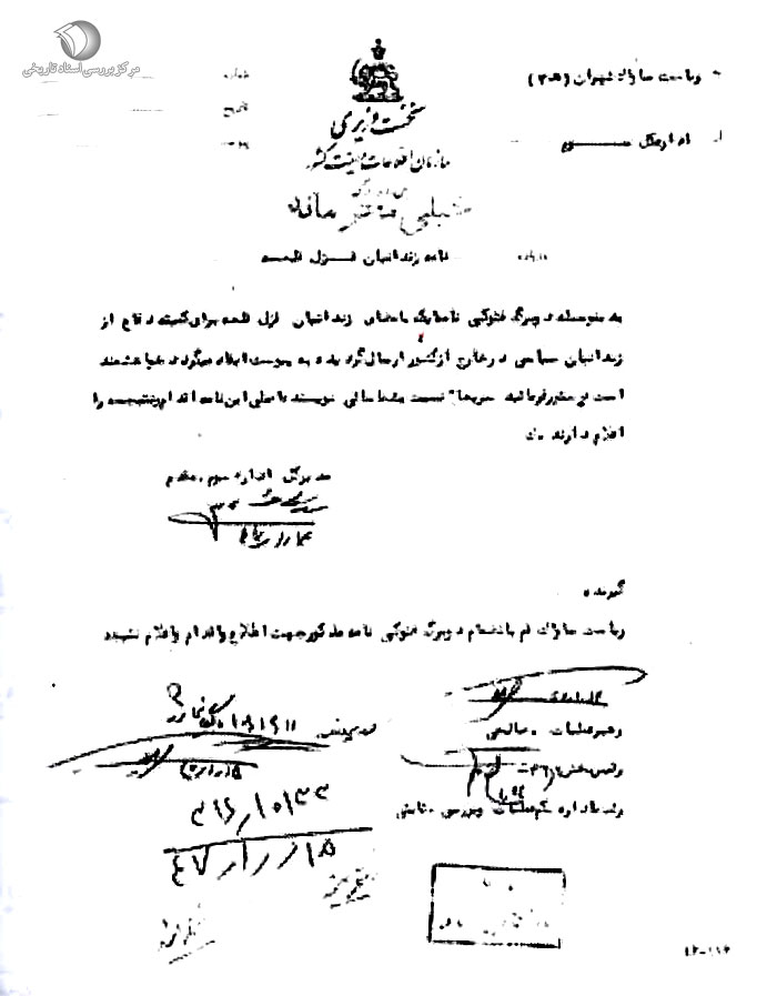 بدینوسیله دو برگ فتوکپی نامهای که به امضای زندانیان قزل قلعه برای کمیته دفاع از زندانیان سیاسی در خارج از کشور ارسال گردیده به پیوست ایفاد میگردد. خواهشمند است دستور فرمائید سریعاً نسبت به شناسایی نویسنده اصلی این نامه اقدام و نتیجه را اعلام دارند.ک