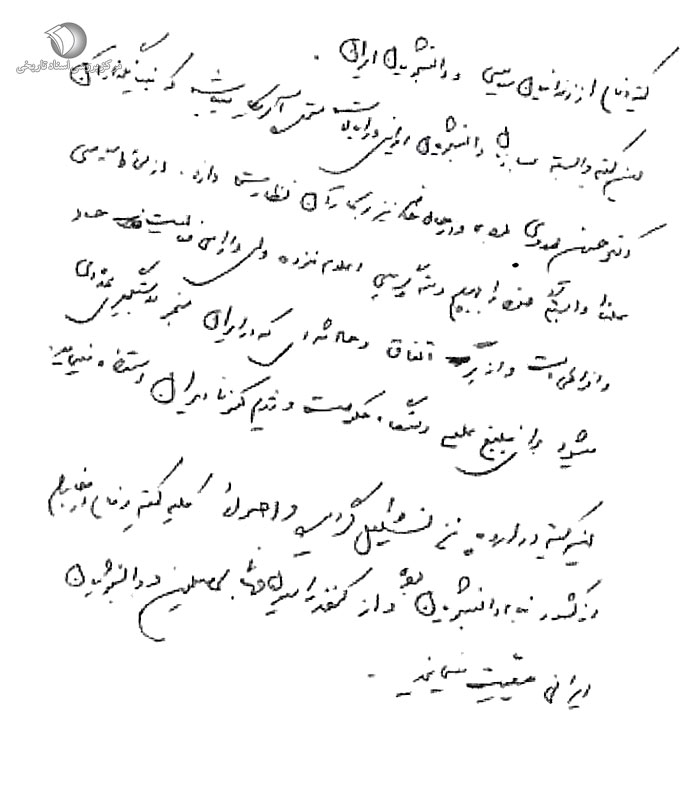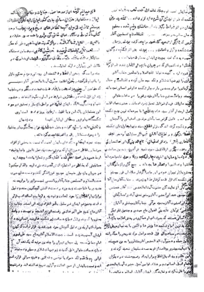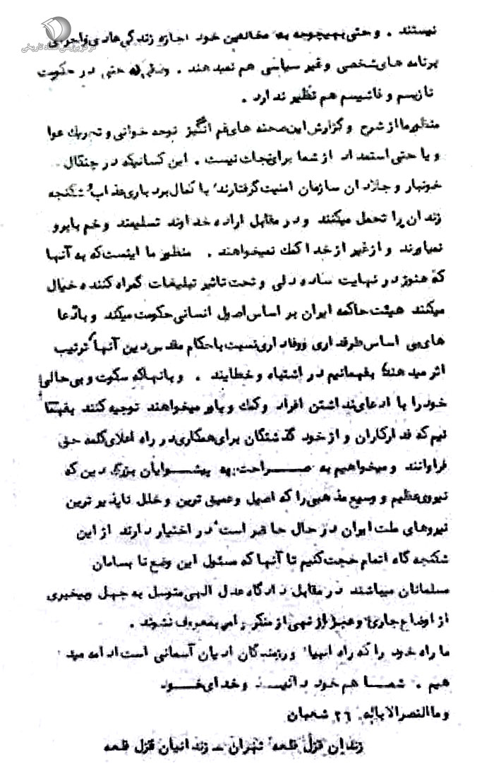 جمع کثیری از بازرگانان محترم بازار تهران هم در این ماجرا گرفتار جلادان قرن بیستم در شکنجهگاه قزل قلعه گرفتار عذاب و زجرند. جناب آقای حاج آقا [ناخوانا] یکی از نمایندگان حضرت آیتالله العظمی آقای خمینی، آقای موسوی همدانی، حضرت آقای رستمی نجف آبادی، جناب آقای روحانی، حضرت آقای محمود مرآتی، جناب آقای بهشتی و آقایان کلافچی، ترکمان عابدینی، اخوان حاج مهدی و چندین نفر دیگر کسانی هستند که به صرف اتهام همکاری در پخش اعلامیه بازداشت و [تحت] شدیدترین انواع شکنجهها و زجرها و اکنون با بدنهای مریض و شرایط سخت در سیاهچال قزل قلعه مراحل مرگ تدریجی را میگذرانند [ناخوانا] این حمله و هجوم آیتالله العظمی آقای منتظری را بدون هیچ سند با نهایت بیشرمی و وقاحت از قم به مسجد سلیمان تبعید کردند و این ظلم و بیداد به قرار اطلاع برای ایجاد رعب و وحشت در دیگران بوده است. برخلاف تمام اصول انسانیت و برخلاف قوانین، منزل حضرت آیتالله العظمی خمینی را غارت کردند و نمایندگان ایشان آقایان [علی اکبر تربتی] اسلامی و [حسن] صانعی را مراجعات مسلمانان و پرداختن شهریه معظمله که کمکی به بودجه ضعیف و بیپناه حوزه علمیه قم است ممنوع کردهاند و با این رفتار نشان میدهند که در مقابل خودسریها و خلافکاریها و مظالم و ستمگریهای خود آمادگی و تحمل هیچگونه انتقاد و نصیحت و راهنمایی را [ناخوانا]. لازم میدانیم گوشهای از صدها صحنه جنایات و مظالم هیئت حاکمه ایران و مسئلهای از هزاران مسائل جاری کشور ایران را به نظر آن حضرات برسانیم تا شاید از میان آن همه تظاهرهای دروغ و پرده پوشیها و حق کشیها که توسط دستگاه و عمال خائن آن میشود را همه به سوی حقیقت و واقعیت در اختیار شما گذاشته و مراکز قدرتهای مذهبی و ملی که ممکن است تحت تأثیر تبلیغات فریبنده خوشبینی کاذبی نسبت به این دستگاه جنایتکار داشته باشند متوجه وظایف سنگین و مسئولیتهای خطیری که در مقابل این جباران دارند نمایند.