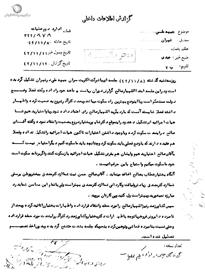 روز سهشنبه گذشته (8 / 11 / 42) جلسهای با شرکت اکثریت سران جبهه ملی در تهران تشکیل گردیده است و در این جلسه ابتدا اللهیار صالح گزارش دوران ریاست 5 ماهه خود را داده و گفته که: