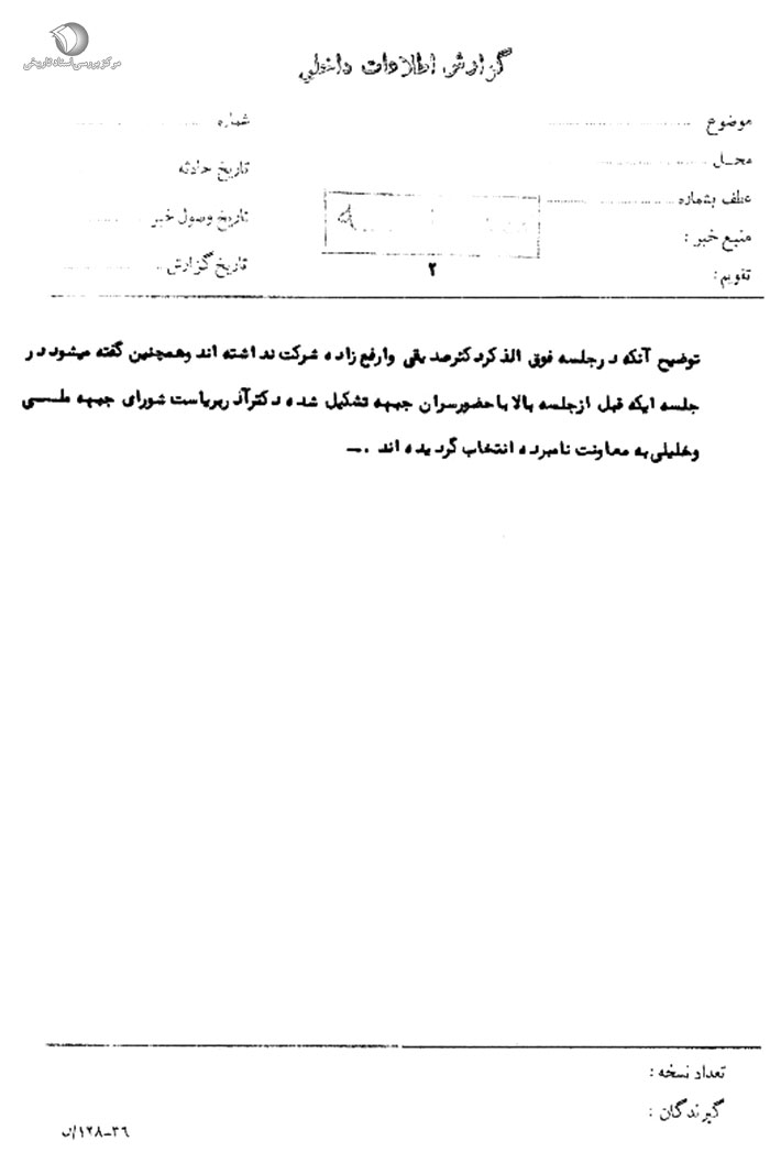 توضیح آن که در جلسه فوقالذکر دکتر صدیقی و ارفع زاده شرکت نداشتهاند و همچنین گفته میشود در جلسهای که قبل از جلسه بالا با حضور سران جبهه تشکیل شده است، دکتر آذر به ریاست شورای جبهه ملی و خلیلی به معاونت نامبرده انتخاب گردیدهاند.