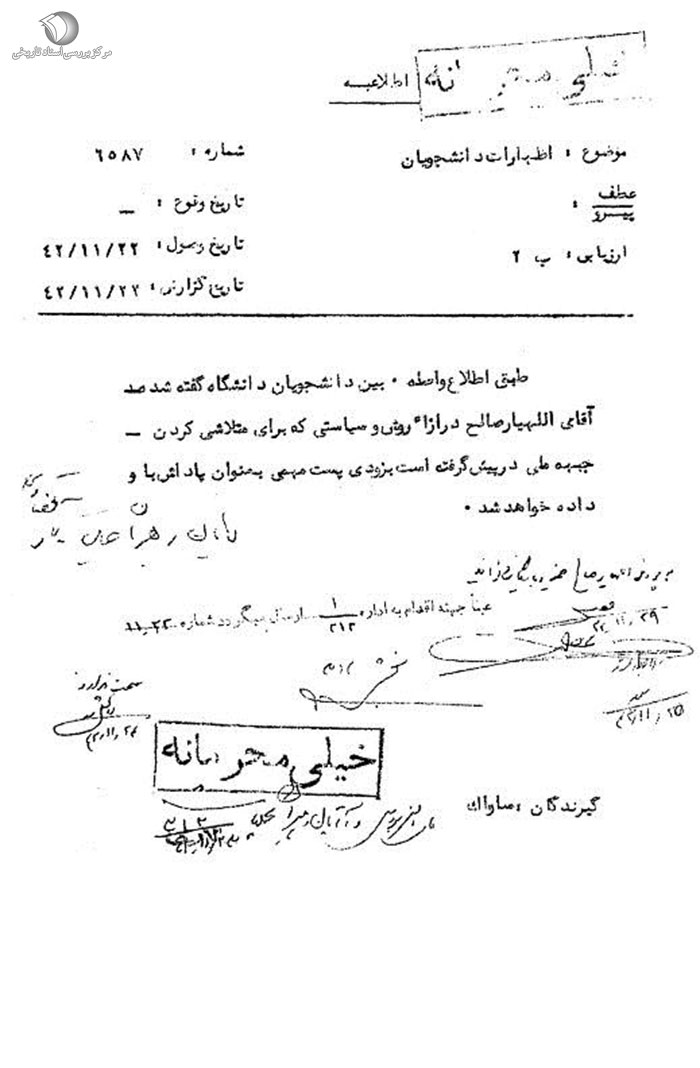 طبق اطلاع واصله، بین دانشجویان دانشگاه گفته شده آقای اللهیار صالح در ازاء روش و سیاستی که برای متلاشی کردن جبهه ملی در پیش گرفته است، به زودی پست مهمی به عنوان پاداش به او داده خواهد شد.