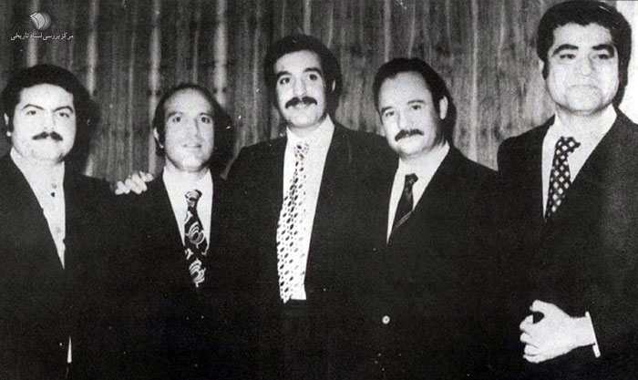 از راست: بهمن نادریپور معروف به تهرانی، شهاب مدیرکل اداره چهارم ساواک(حفاظت و اطلاعات)، مصطفی هیراد معروف به مصطفوی، رضا عطارپور مجرد معروف به دکتر حسینزاده، هوشنگ عطایی معروف به هوشنگ