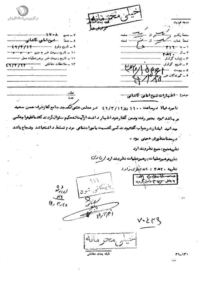 نامبرده بالا در ساعت 1600 روز 12 / 3 / 49 در مجلس ختمی که در مسجد جامع که از طرف حسن سعید برپا شده بود به منبر رفت و ضمن گفتار خود اظهار داشت: از آیتاله حکیم سؤال کردند که شما فقیه را چه کسی میدانید؟ ایشان در جواب گفته بودند: کسی که نسبت به امور اجتماعی مردم تسلط داشته باشد و شجاع باشد، در معنا منظورش خمینی بود.