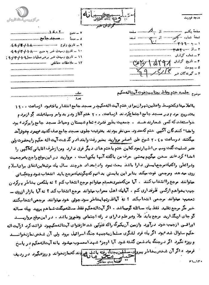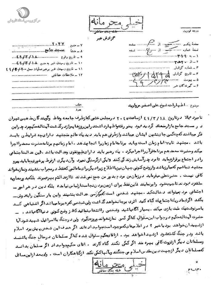 نامبرده بالا در تاریخ 18 / 3 / 49 از ساعت 2045 در مجلس ختمی که از طرف جامعه وعاظ و گویندگان مذهبی تهران در مسجد جامع بازار منعقد گردیده بود به منبر رفته و اظهار داشت: در این روزها پس از درگذشت آیتالله حکیم مردم در این فکر میباشند که چه کسی جانشین ایشان میباشد و از طرفی هم باید دید یک عالم مجتهد دارای چه شرایطی باید باشد. مجتهد نایب امام زمان است و باید برنامه امام زمان را انجام بدهد. امام زمان هم برنامه حضرت محمد را اجرا میکند و حضرت محمد هم برنامه قرآن را اجرا میکرد. یک رهبر باید دارای علم و تقوی و عدالت باشد. دین عدالت اجتماعی را در اجتماع برقرار مینماید تا مردم در آسایش زندگی کنند و یکی از گرسنگی نمیرد و آن دیگری از فرط پرخوری و ما باید پیرو مجتهدی باشیم که مبارز باشد و از وضع کنونی جهان نیز با اطلاع، زیرا دیگر برای ما عالمی که فقط در محراب بنشیند و نماز بخواند کافی نیست. حضرت علی میفرماید در زمان من مردم به دور من جمع نمیشدند تا از عدالتم بهره ببرند بلکه به دور معاویه حلقه زده بودند تا جیب خود را پر نمایند. دین فقط برای از بین بردن نجاست از لباس نیامده بلکه دین در هر امور اجتماعی مردم میتواند دخالت کند. مجتهد شخصی است که بر کرسی عدالت بنشیند و این بار سنگین را به دوش بکشد اگر شما در یک اجتماع یک گناه کنید اثری بر جا نخواهد گذاشت ولی شخصی که رهبر ما میباشد اگر اشتباهی کند با سرنوشت یک ملت بازی میکند. بسیار آگاه باشید و شخصی را انتخاب نمایید که از وضع کنونی دنیا آگاه باشد. حضرت آیتالله حکیم در جواب این سؤال که اگر کسی نماز نخواند و روزه نگیرد ولی در جنگ با اسرائیل شهید شود آیا از شهیدان خواهد بود یا خیر؟ در اعلامیهای که موجود است جواب دادهاند اگر هدف این شخص پیشبرد اسلام باشد و در جنگ کشته شود از شهدا خواهد بود. از آقای حکیم سؤال شده که اگر مسلمانان در حال جنگ باشند و مسلمانان دیگر از ثروت کافی بهرهمند اگر کمکی نکنند گناهکارند. آقای حکیم جواب داد اگر مسلمان بداند که مسلمانان دیگر از جهت دین مقدس اسلام میجنگند و به آنها کمکی نکند از گناهکاران است. ولی بعد از این مسایل که گفتم چه کسی میتواند یک نفر مجتهد را انتخاب بکند؟ جواب آن است که نه طبقه وعاظ، نه محرابیها، نه بازاریها، نه آن که صاحب قدرت است. بلکه فقط و فقط توده مردم این حق [را] دارند. مردم باید از افراد عالم بپرسند. امروز مسلمانان در وضعی قرار دارند که یک کشور دو میلیونی اسرائیل 100 میلیون مسلمان را شکست داده است. پس باید در این موقع مجتهد کسی باشد که دین اسلام را نگهدارد تا هر روز جوانان مسلمان زیر بمبهای آتشزای اسرائیل نسوزند. تلگرافهای زیادی از قم مخابره شده که فتوکپی چند عدد آن در نزد من است و به عرض شما میرسانم و بعد متن تلگرافی را خواند و افزود این افرادی که نام بردم از طبقات مختلف میباشند که به خدا قسم هیچ نظری ندارند و فقط نظریهشان را در مورد شخصی که باید مجتهد باشد گفتهاند که ایشان هم حضرت آیتالله خمینی است که دارای تمام شرایط رهبریت میباشند.
