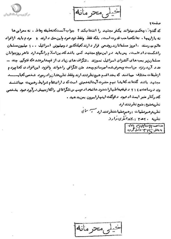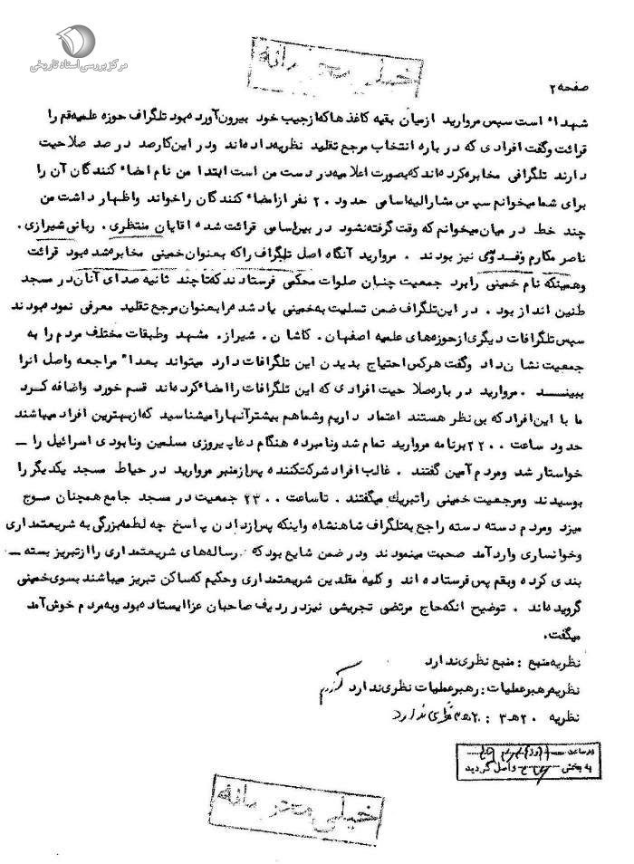 سپس مروارید از میان بقیه کاغذها که از جیب خود بیرون آورده بود تلگراف حوزه علمیه قم را قرائت و گفت افرادی که درباره انتخاب مرجع تقلید نظریه دادهاند و در این کار صددرصد صلاحیت دارند تلگرافی مخابره کردهاند که به صورت اعلامیه در دست من است ابتدا من نام امضاءکنندگان آن را برای شما میخوانم سپس مشارالیه اسامی حدود 20 نفر از امضاءکنندگان را خواند و اظهار داشت: من چند خط در میان میخوانم که وقت گرفته نشود در بین اسامی قرائت شده آقایان منتظری، ربانی شیرازی، ناصر مکارم و قدوسی نیز بودند. مروارید آنگاه اصل تلگراف را که به عنوان خمینی مخابره شده بود قرائت و همین که نام خمینی را برد جمعیت چنان صلوات محکمی فرستادند که تا چند ثانیه صدای آنان در مسجد طنینانداز بود. در این تلگراف ضمن تسلیت به خمینی یادشده را به عنوان مرجع تقلید معرفی نموده بودند. سپس تلگرافات دیگری از حوزههای علمیه اصفهان، کاشان، شیراز، مشهد و طبقات مختلف مردم را به جمعیت نشان داد و گفت هر کس احتیاج به دیدن این تلگرافات دارد میتواند بعداً مراجعه و اصل آن را ببیند. مروارید درباره صلاحیت افرادی که این تلگرافات را امضاء کردهاند قسم خورد و اضافه کرد ما با[به] این افراد که بینظر هستند اعتماد داریم و شما هم بیشتر آنها را میشناسید که از بهترین افراد میباشند. حدود ساعت 2200 برنامه مروارید تمام شد و نامبرده هنگام دعا پیروزی مسلمین و نابودی اسرائیل را خواستار شد و مردم آمین گفتند.