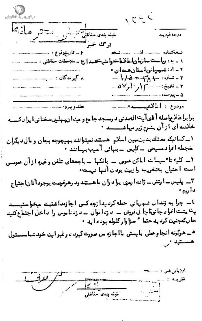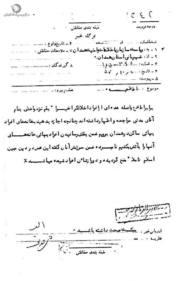 از: شهربانی استان همدان شماره: ۳۸۱ - 5 / 1