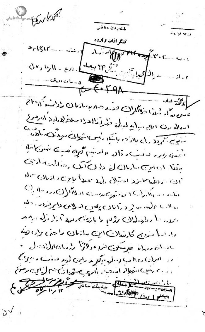 عصر روز گذشته اخلالگران قصد حمله به سازمان را داشته که حاج اسداله مدنی اعلام مینماید بعد از ظهر تظاهرات نخواهد بود که موضوع منتفی میگردد ولی با توجه به این که رئیس شهربانی سرهنگ شاهدوست شخصی ترسو و ضعیف و قادر به تصمیم گیری نیست ضمن این که به تقاضای این سازمان از دادن کمک و حفاظت خارجی آن خودداری نمود، احتمال دارد مجدداً به این سازمان حمله نمایند و هم اکنون امور شهری به دست اخلالگران و روحانیون مخالف اداره میشود و آنان پلیس اسلامی دایر نموده و کلیه خودروها و طرفداران رژیم را بازرسی و مورد آزار قرار میدهند و اساساً خروج کارمندان این سازمان را حتی برای تهیه مایحتاج روزانه غیر ممکن نموده و اکثراً رؤسای ادارات از روحانیون مخالف دستور میگیرند و این مؤید ضعف رهبری و ترس رئیس شهربانی است و مأمورین شهربانی هم از این موضوع ناراحت میباشند.