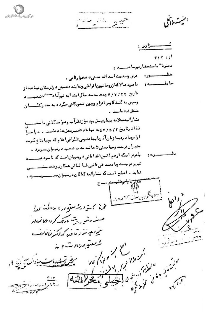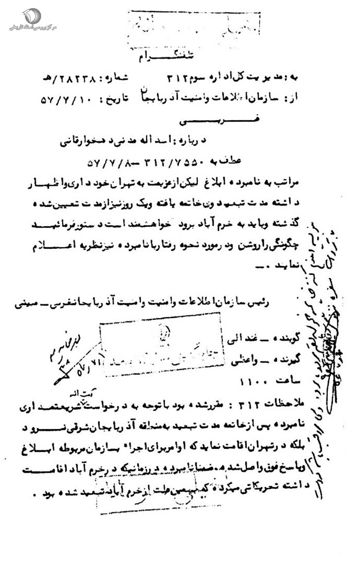 سابقه: نامبرده بالا که از روحانیون افراطی و نماینده خمینی در لرستان میباشد از تاریخ 27 / ۷ / 54 به مدت سه سال ابتدا به نورآباد ممسنی تبعید و سپس به گنبدکاووس اعزام و چون تحریکاتی میکرده به بندر کنگان منتقل شده است. مشارالیه مبتلا به بیماری سل بوده و از نظر آب و هوا مشکلاتی داشته لذا در تاریخ 3 / ۵ / 57 به مهاباد تغییر محل داده است. در اجرای اوامر صادره به سازمان آذربایجان غربی تلگرافی اعلام که به وی ابلاغ گردد به تهران عزیمت و میبایستی تا خاتمه مدت تبعید در تهران به سر برد.