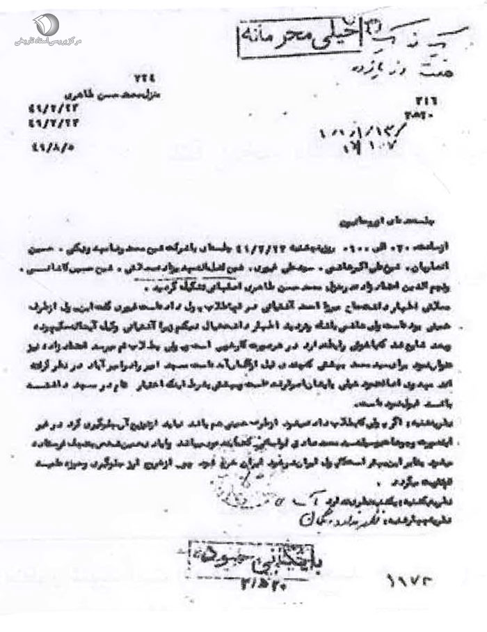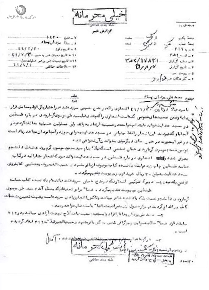 توضیخ شنبه: موسوی گرمارودی همان شخصی است که قبلاً به نام سید محمود موسوی گرمارودی شغل دانشجو معرفی شده و اشعاری درباره فلسطین در مسجد هدایت خوانده بود که اشعار مشارالیه در کتاب حماسه فلسطین چاپ شده و اینک یک نسخه کتاب موصوف از باقر مشهدی حبیبالله معروف به خطیبی کتابفروش مسجد هدایت به مبلغ 30 ریال خریداری و به پیوست تقدیم میگردد.