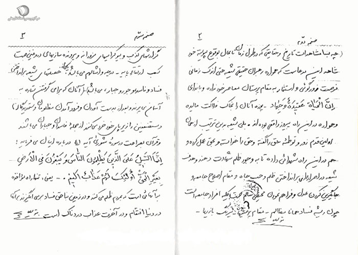 صفحۀ دوم و سوم متن دست نویس دفاعیات احمد متوسلیان در دادگاه رژیم پهلوی