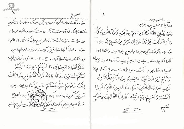 صفحۀ چهارم و پنجم متن دست نویس دفاعیات احمد متوسلیان در دادگاه رژیم پهلوی