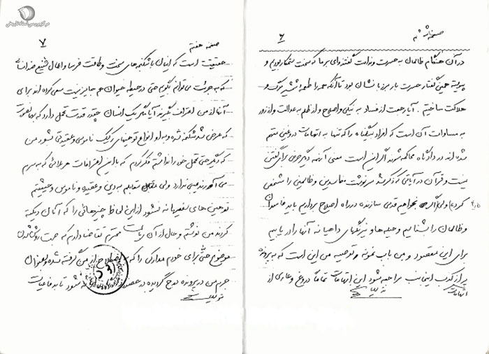 صفحۀ ششم و هفتم متن دست نویس دفاعیات احمد متوسلیان در دادگاه رژیم پهلوی