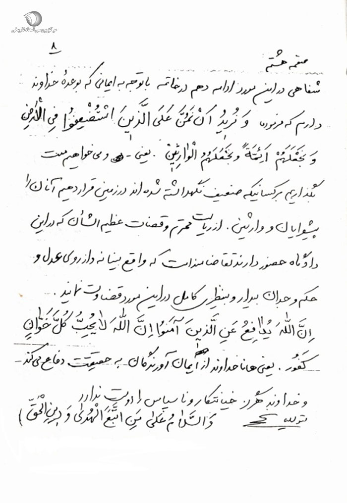 صفحۀ هشتم متن دست نویس دفاعیات احمد متوسلیان در دادگاه رژیم پهلوی