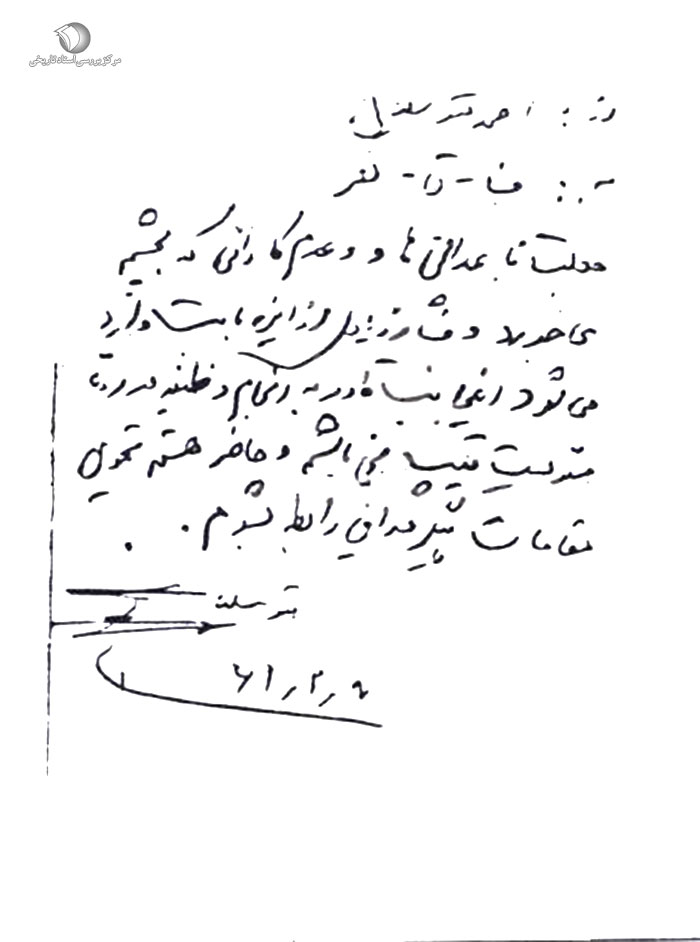 از: شهربانی استان لرستان (اطلاعات) به: ریاست سازمان اطلاعات و امنیت استان لرستان در مورد: «احمد متوسلیان» فرزند غلامحسین، ساعت 2 روز 15 / 06 / 57 اطلاع رسید که شخصی در خیابان پهلوی، چهارراه بانک، مغازه فتوکپی کیومرث، مشغول تکثیر اعلامیه مضره می باشد که بلافاصله [به] وسیله مأمورین مربوطه دستگیر گردید. علی هذا، ضمن ارسال 9 برگ پرونده متشکله، نامبرده بالا اعزام و معرفی میگردد. ضمناً تعداد 94 برگ اعلامیه و 2 عدد کتاب مضره و تعداد 56 عدد نوار قابل بررسی، از منزل وی کشف و ارسال میگردد.