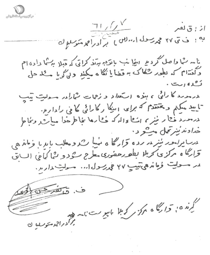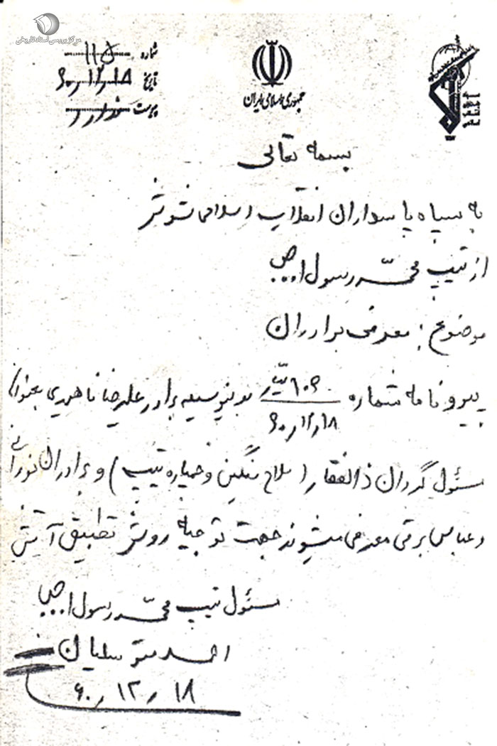 14 دی 1360، نامۀ فرمانده سپاه مریوان به فرماندۀ سپاه پاوه در پایان عملیات محمد رسول الله(ص)