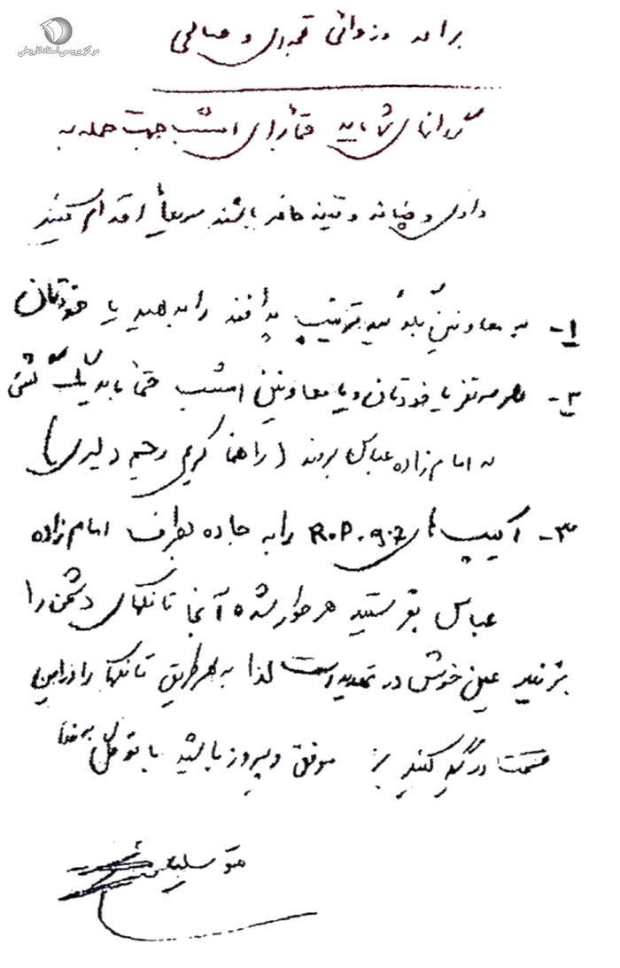 بهار 1361، دستور کتبی حاج احمد متوسلیان به فرماندهان گردان های حبیب، سلمان و بلال جهت مقابله با مزاحمت تانک های لشکر 10 زرهی دشمن در محورهای واوی، چنانه و تینه در نبرد فتح.