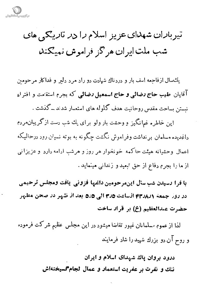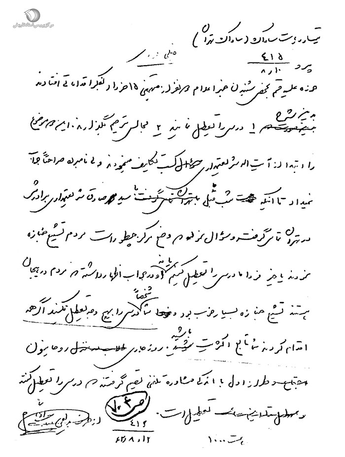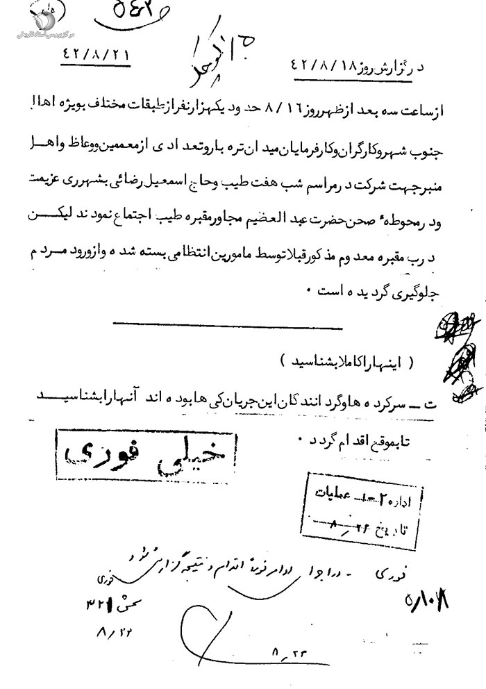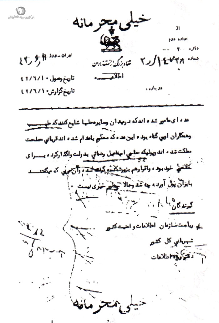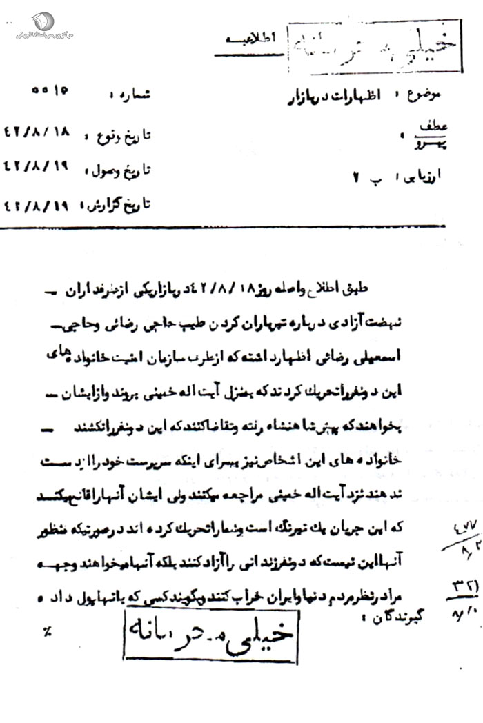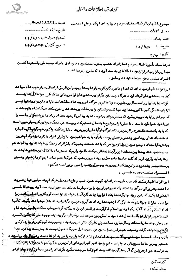 [20] آرشیو مرکز اسناد انقلاب انقلاب اسلامی، پرونده تظاهرات 15 خرداد، کد بازیابی: 119، سند شماره 278.