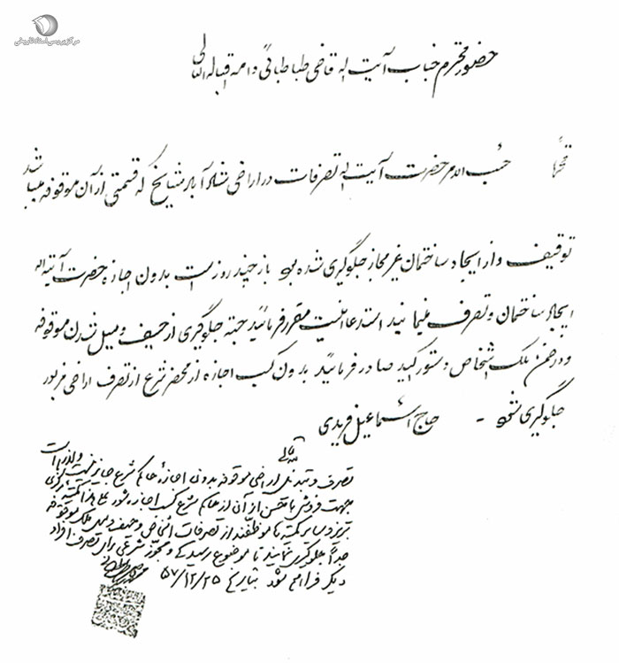 محترماً حسبالامر حضرت آیتالله تصرفات در اراضی شادآباد مشایخ که قسمتی از آن موقوفه میباشد، توقیف و از ایجاد ساختمان غیر مجاز جلوگیری شده بود، باز چند روز است بدون اجازه حضرت آیتالله ایجاد ساختمان و تصرف مینمایند، استدعا اینست مقرر فرمائید جهت جلوگیری از حیف و میل شدن موقوفه و در ضمن ملک اشخاص دستور اکید صادر فرمائید بدون کسب اجازه از محضر شرع از تصرف اراضی مزبور جلوگیری شود.