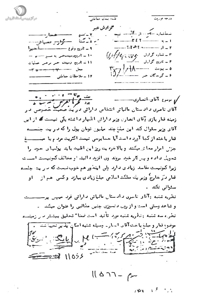 آقاى ناصرى دادستان مالیاتى انتظامى دارایى در یک صحبت خصوصى در زمینه قماربازى آقاى انصارى وزیر دارایى اظهار داشته: یکى نیست از این آقاى وزیر سئوال کند این مبلغ چند میلیون تومان پول را که در یک جلسه قمار باخته از کجا آورده است. آیا حسابرسى نیست. اکثریت مردم با مبلغ جزئى امرار معاش مىکنند و بالاخره یک روز این اقلیت باید پولهاى خود را تحویل داده و پى کار خود بروند. وى افزوده البته او مخالف کمونیست است زیرا کمونیست مفاسد زیادى دارد ولى این طور هم خوب نیست که در یک جلسه قمار در خارج وزیر یک مملکت اسلامى مبلغ زیادى ببازد و کسى هم از او سئوالى نکند.