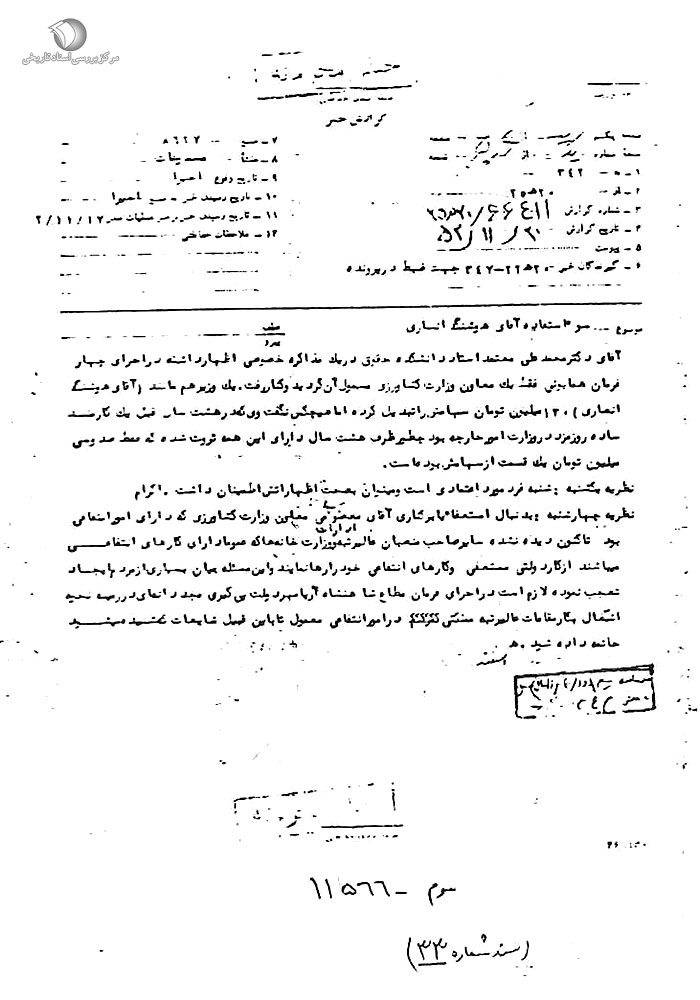 نظریه چهارشنبه: به دنبال استعفاء یا برکنارى آقاى معصومى معاون وزارت کشاورزى که داراى امور انتفاعى بود تاکنون دیده نشده سایر صاحبمنصبان عالىرتبه و وزارتخانهها که عموماً داراى کارهاى انتفاعى مىباشند از کادر دولتى مستعفى و کارهاى انتفاعى خود را رها نمایند و این مسئله میان بسیارى از مردم ایجاد تعجب نموده لازم است در اجراى فرمان مطاع شاهنشاه آریامهر دولت پىگیرى مجدانهاى در زمینه نحوه اشتغال به کار مقامات عالىرتبه مملکتى در امور انتفاعى معمول تا به این قبیل شایعات که شنیده مىشود خاتمه داده شود. هـ