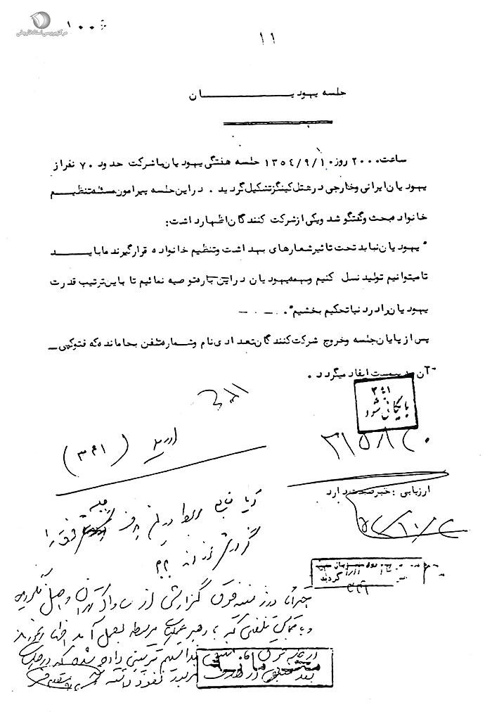 ساعت 2000 روز 10 / 9 / 1354 جلسه هفتگى یهودیان با شرکت حدود 70 نفر از یهودیان ایرانى و خارجى در هتل کینگر تشکیل گردید. در این جلسه پیرامون مسئله تنظیم خانواده بحث و گفتگو شد و یکى از شرکت کنندگان اظهار داشت: