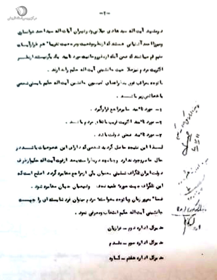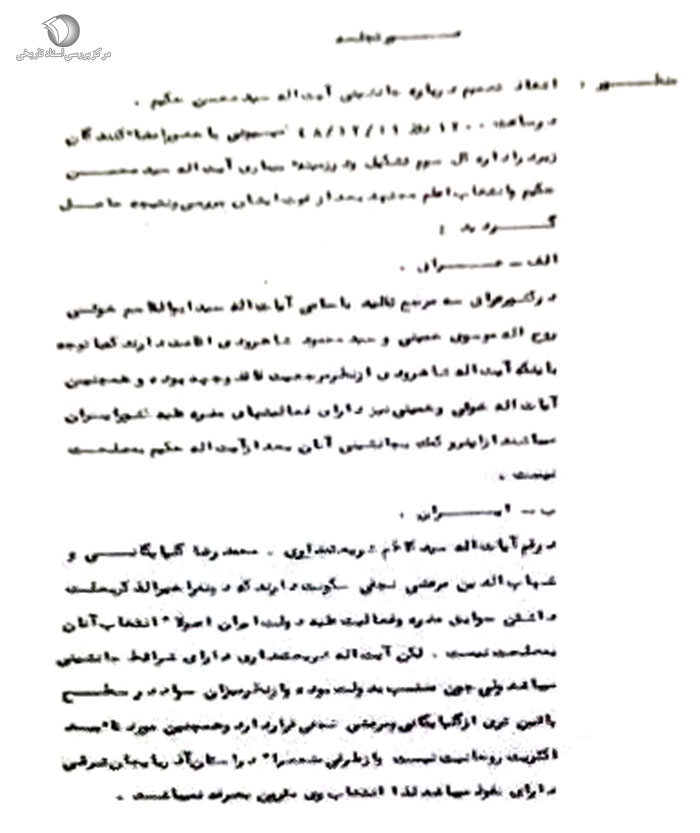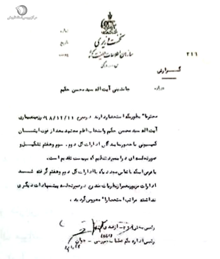 در ساعت 1200 روز 11 / 12 / 48 کمیسیونی با حضور امضاء کنندگان زیر در اداره کل سوم تشکیل و در زمینهی بیماری آیتالله سید محسن حکیم و انتخاب اعلم مجتهد بعد از فوت ایشان بررسی و نتیجه حاصل گردید: