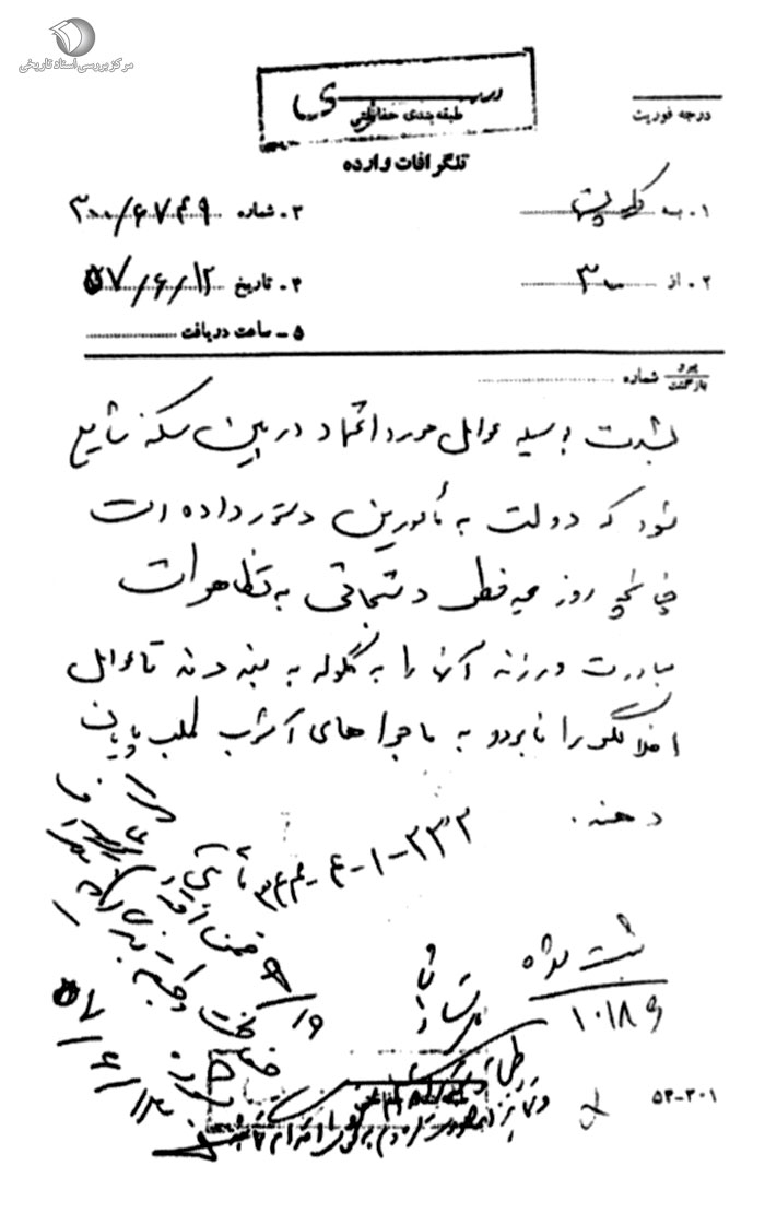 ۱۹ه. ضمن اقدام رعایت حفاظت و طبقهبندی این تلگراف بشود. ۱۳ / ۶ / ۵۷