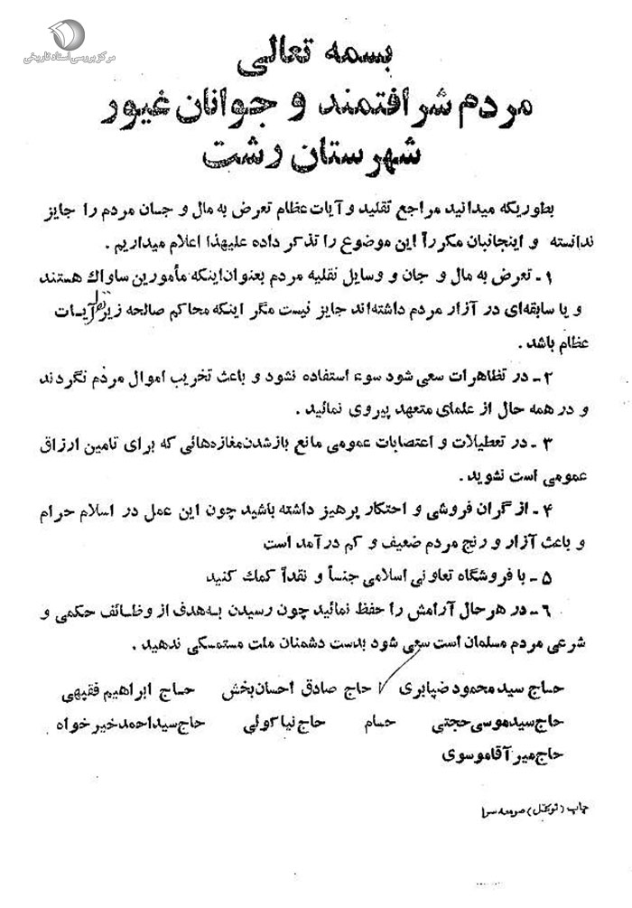به طوری که میدانید مراجع تقلید و آیات عظام تعرض به مال و جان مردم را جایز ندانسته و این جانبان مکرراً این موضوع را تذکر داده علیهذا اعلام میداریم.