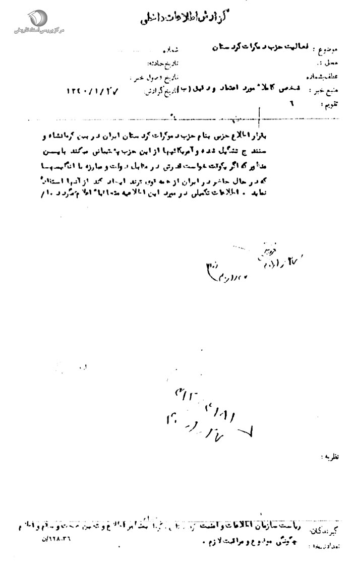 به قرار اطلاع حزبى به نام حزب دموکرات کردستان ایران در بین کرمانشاه سنندج تشکیل شده و آمریکائیها از این حزب پشتیبانى میکنند به این منظور که اگر یک وقت خواست قدرتى در مقابل دولت و مبارزه با انگلیسها که در حال حاضر در ایران از همه قوىترند ایجاد کند از آنها استفاده نماید. اطلاعات تکمیلى در مورد این اطلاعیه متعاقباً اعلام میگردد.