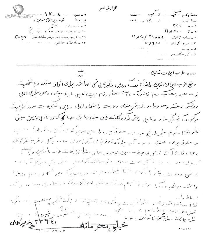 وضع حزب ایران نوین واقعاً تأسفآور شده و غیرقابل تحمل مىباشد. براى افراد مستعد و با شخصیت حزب به صورت یک سلاخخانه در آمده است. علناً در تمام زمینهها فامیلبازى مىشود و محلى براى افراد روشنفکر و معتقد وجود ندارد. ارزش معنوى و مهارت و استعداد افراد در این تشکیلات مورد نظر نیست. هر کسى در آنجا به فکر خود و فامیل و حتى نوکر و کلفتهاى خود مىباشد. چنان که از فامیل مهندس معینى قائممقام دبیرکل بیش از پنج نفر در حزب حقوق مىگیرند و از فامیل منوچهر کلالى دبیر و سناتور بلورى چندین نفر حقوقبر حزب هستند. در حزب گفته مىشود که تمام هزینههاى دکوراسیون خانه دبیرکل و هزینه سفرهاى وى به خارج از کشور از محل بودجه حزب تأمین شده و بدرخانى مسئول تدارکات حزب مأمور این کار است.
