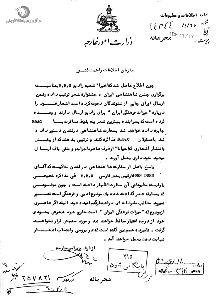 چون اطلاع حاصل شد که اخیراً شعبه رادیو B.B.C به مناسبت برگزاری جشن شاهنشاهی ایران، جشنواره شعر ترتیب داده و ضمن ارسال اوراق چاپی از شنوندگان دعوت کرده است اشعار خود را درباره «میراث فرهنگی ایران» برای رادیو ارسال دارند و وعده کرده است که به سراینده بهترین شعر یک بلیط مسافرت با BOAC جایزه داده خواهد شد، به سفارت شاهنشاهی در لندن دستور داد شد با مسئولان B.B.C مذاکره کنند و ترتیبی بدهند که از پخش و انتشار اشعاری که احیاناً از طرف عناصر ماجراجو و منفیباف ارسال میشود، خودداری به عمل آورند.