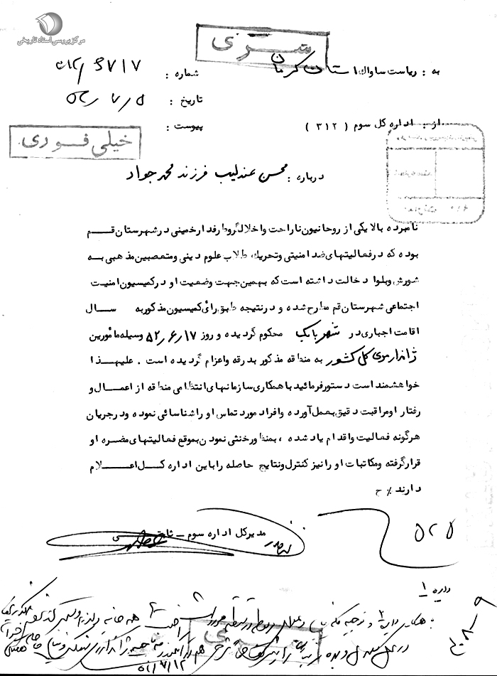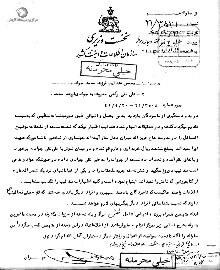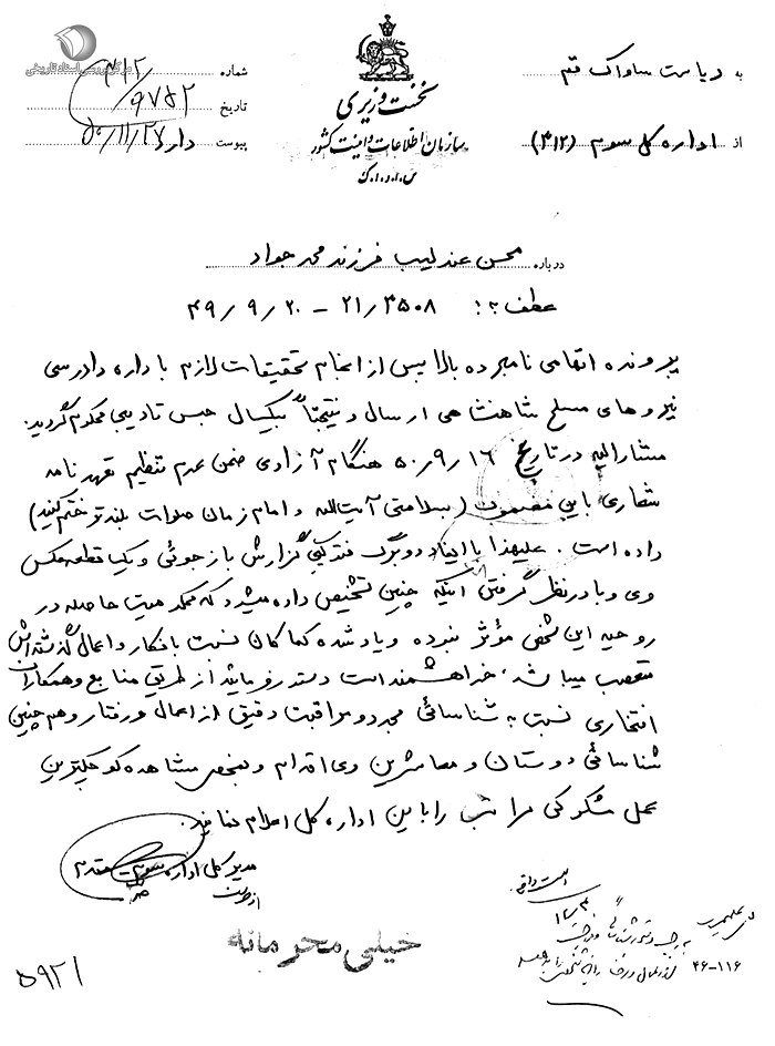 ساواک قم نیز در پاسخ به نامه مذکور خطاب به مدیریت کل اداره سوم مینویسد: «... مشارالیه با حسن جنتی که هر دو با هم در زندان بودهاند رفت و آمد میکند شناسایی برای دوستان و معاشرین دیگر او ادامه دارد ضمناً اعمال و رفتار وی تحت مراقبت منابع این ساواک میباشد.»