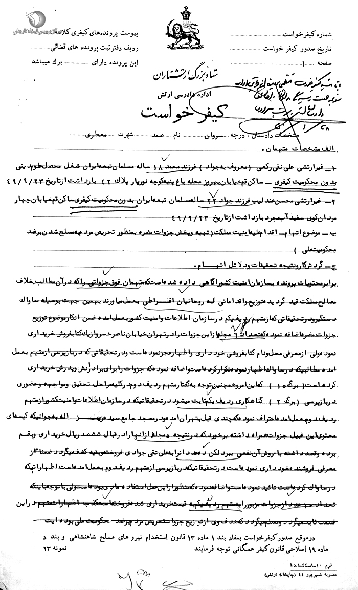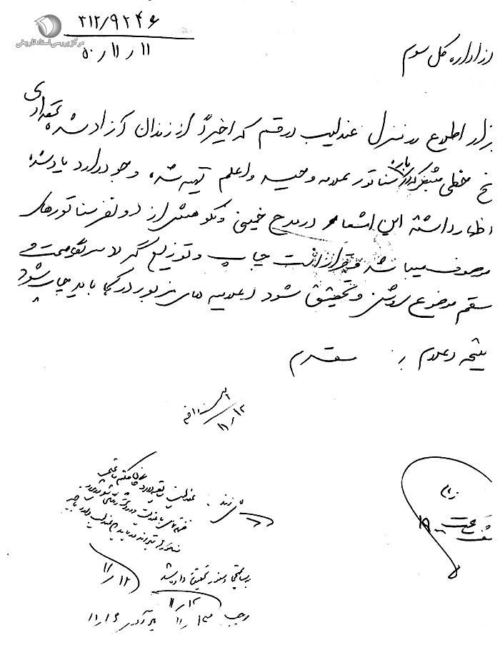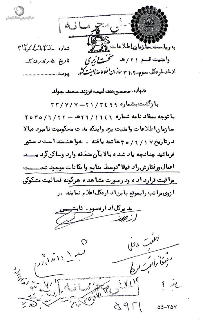 مکاتبه ساواک درمورد پایان محکومیت مرحوم عندلیب