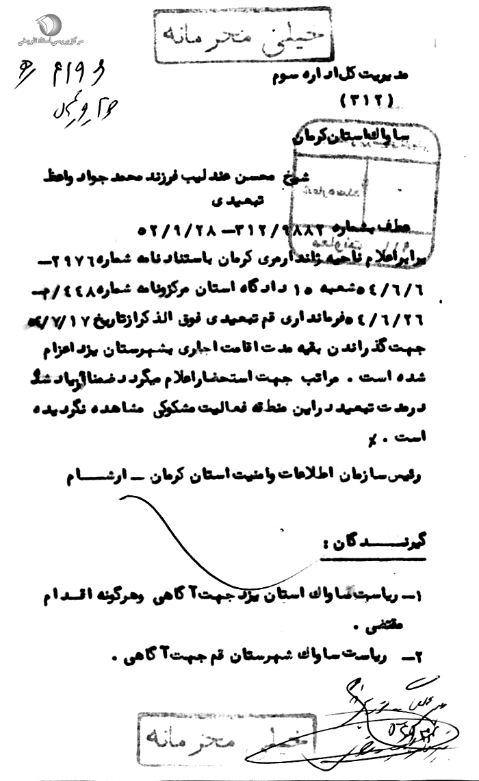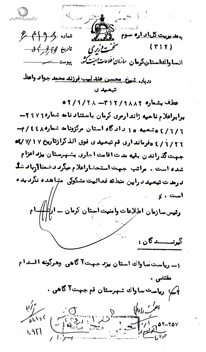 مکاتبه ساواک در مورد تغییر محل تبعید مرحوم عندلیب