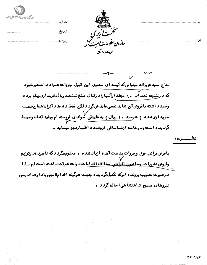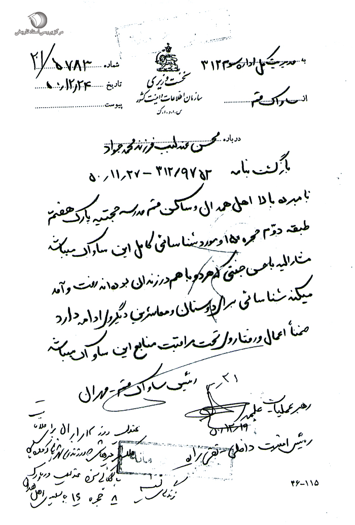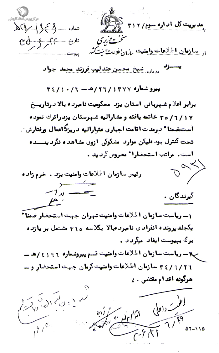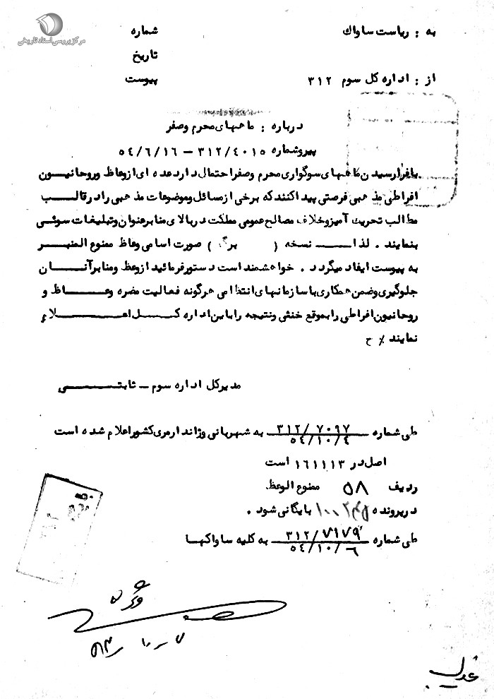 مکاتبه ساواک در مورد کنترل فعالیتهای مرحوم عندلیب