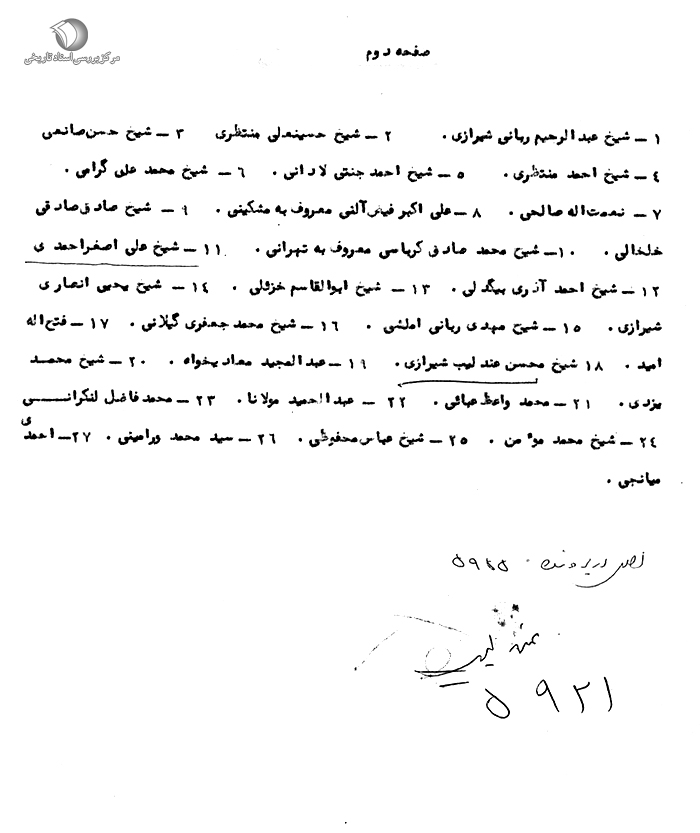 [23] . ساواک در گزارشی نام، شهرت، نام پدر و محل اقامت اجباری 25 نفر را اینگونه اعلام میکند: 1.عبدالرحیم ربانی شیرازی بمانعلی چاه بهار2.حسینعلی منتظری حاجیعلی طبس 3.حسن صانعی محمد علی مشکین شهر 4.احمد منتظری علی شاه پسند 5.احمدجنتی لادانی هاشم اسدآباد همدان 6.محمد علی گرامی عباس بم کرمان 7. نام: نعمتاللّه شهرت: صالحی نجف آبادی نام پدر: محمدتقی محل اقامت اجباری: ابهر زنجان 8ـ نام: علیاکبر شهرت: فیض کاشانی نام پدر: ملاعلی محل اقامت اجباری: ماهان کرمان 9ـ نام: محمد صادق شهرت: صادقی گیوی نام پدر: یداله محل اقامت اجباری: انارک یزد 10ـ نام: محمد صادق شهرت: کرباسچی نام پدر: ابوالقاسم محل اقامت اجباری: نرماشیر کرمان 11ـ نام: علیاصغر شهرت: احمدی نام پدر: محمدمهدی محل اقامت اجباری: کبوتر آهنگ همدان 12-احمدآذری بیگدلی حسینعلی برازجان 13-ابوالقاسم خزعلی غلامرضا، گناوه بندر بوشهر 14-یحیی انصاری محمد کوهدشت لرستان 15-محمدمهدی ربانی رانکوهی، ابوالمکارم شوشتر 16-محمدجعفری گیلانی محمدحسین نیریز فارس 17-فتحاللّه امید نجف آبادی محمود بندرشاه 18-محسن عندلیب محمود جواد بابک یزد 19-عبدالمجید معادیخواه حسین گنبد کاوس 20-محمد یزدی علی کنگان بندرلنگه 21-محمد واعظ عبائی حسین بندردیلم 22-عبدالحمید مولانا محمود تفت یزد 23-محمد موحدی گیلانی فاضل بندرلنگه 24-محمد دانش زاده عباس شهداد کرمان 25ـ نام: عباس شهرت: محفوظی نام پدر: عیسی محل اقامت اجباری: رفسنجان. ر. ک: آیتالله حاج شیخ عبدالرحیم ربانی شیرازی به روایت اسناد ساواک، تهران، مرکزبررسی اسناد تاریخی، ص 325.