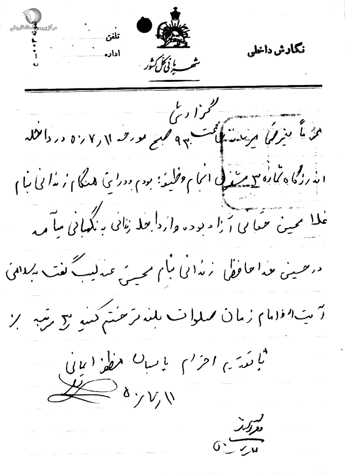 این موضوع نیز در اسناد ساواک مورد اشاره قرار گرفته است: «مشارالیه در تاریخ 16 / 9 / 50 هنگام آزادی ضمن عدم تنظیم تعهدنامه[،] شعاری با این مضمون (به سلامتی آیتالله و امام زمان صلوات بلندتر ختم کنید) داده است...»