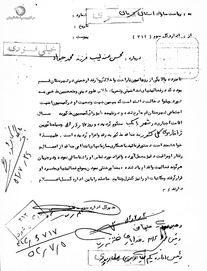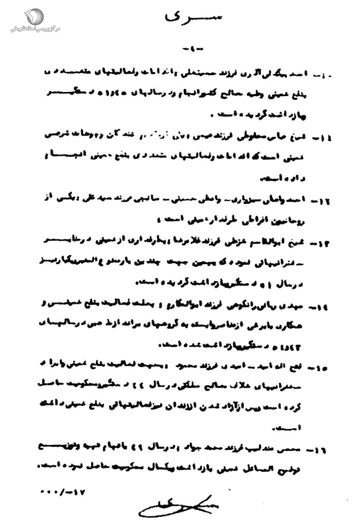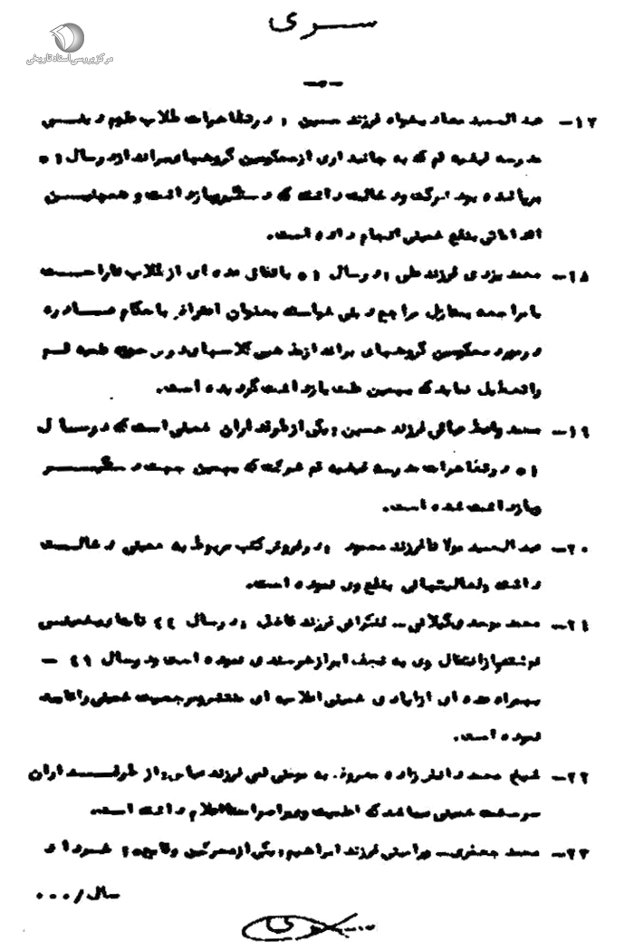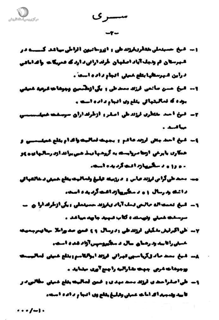 دستگیری این عده به علت شرایط خاصی که از نظر مذهبی در قم وجود داشته قبلاً به مصلحت تشخیص داده نشده بود، لیکن اکنون با استفاده از فرصت و این که پیشبینیهای لازم جهت جلوگیری از تشنجات احتمالی صورت گرفته و به شهربانی کل کشور توصیه گردیده که با تقویت شهربانی شهرستان قم آمادگی کافی برای مقابله با وقایع و تحریکات عناصر ناراحت و متعصبین مذهبی را داشته باشد، تصمیم بر آن است که در صورت استقرار اراده سنیه مبارک ملوکانه اقدام به تبعید تدریجی این افراد از منطقه قم و اعزام آنان به مناطق مختلف و دور دست کشور گردد.» شاه در جواب این گزارش میگوید: «شما که آنها را میشناختهاید چرا تا به حال اقدامی نکردهاید.»