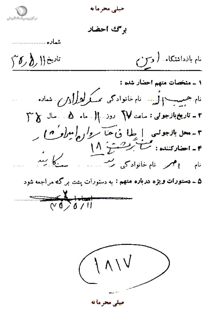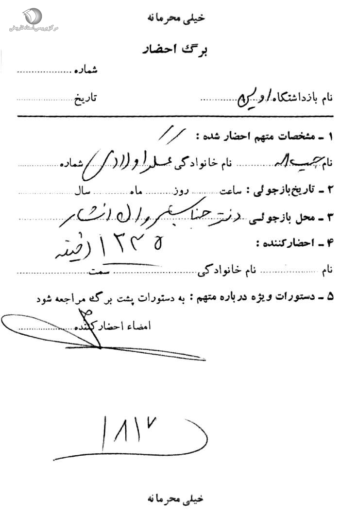 برگ صورت احضار آقای عسکراولادی به اتاق بازجویی