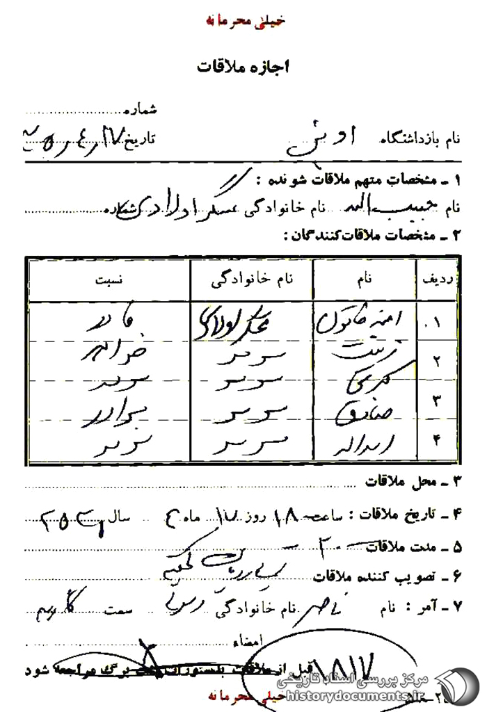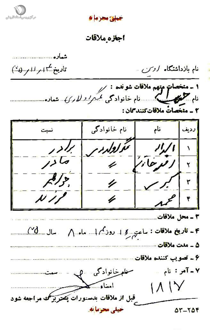 برگ ملاقات خانواده آقای عسکراولادی در اتاق ملاقات