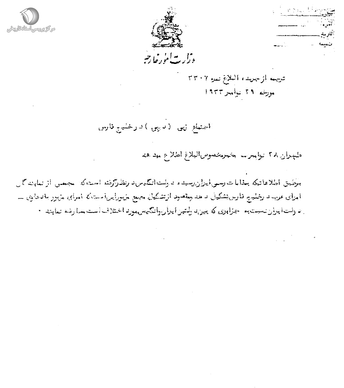 ترجمه از جریده البلاغ نمره 3307 مورخه 29 نوامبر 1933