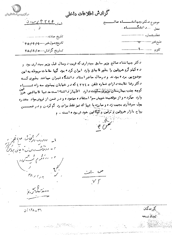 دکتر جهانشاه صالح وزیر سابق بهداری که قریب دو سال قبل وزیر بهداری بود و ده کیلوگرم هروئین را بهطور قاچاق وارد ایران کرده بود؛ گویا مقامات مربوطه به این موضوع پیبرده بودند و در حال حاضر استاد دانشگاه تهران میباشد. بهطوری که دکتر رضا نقابت دارای شماره تلفن 43745 که در خیابان پهلوی سه راه شاه کوچه جنب بیمارستان وزیری سکونت دارد اظهار داشته است مدتها قاچاقی هروئین وارد میکرده و از موقعیت خویش سوءاستفاده مینموده و در ضمن از فروش مواد مخدره پول سرشاری به جیب زده و مبارزه با تریاک نیز فقط رد گم کردن و در ضمن رواج بازار هروئین و مرفین و کوکائین خودش بوده است.